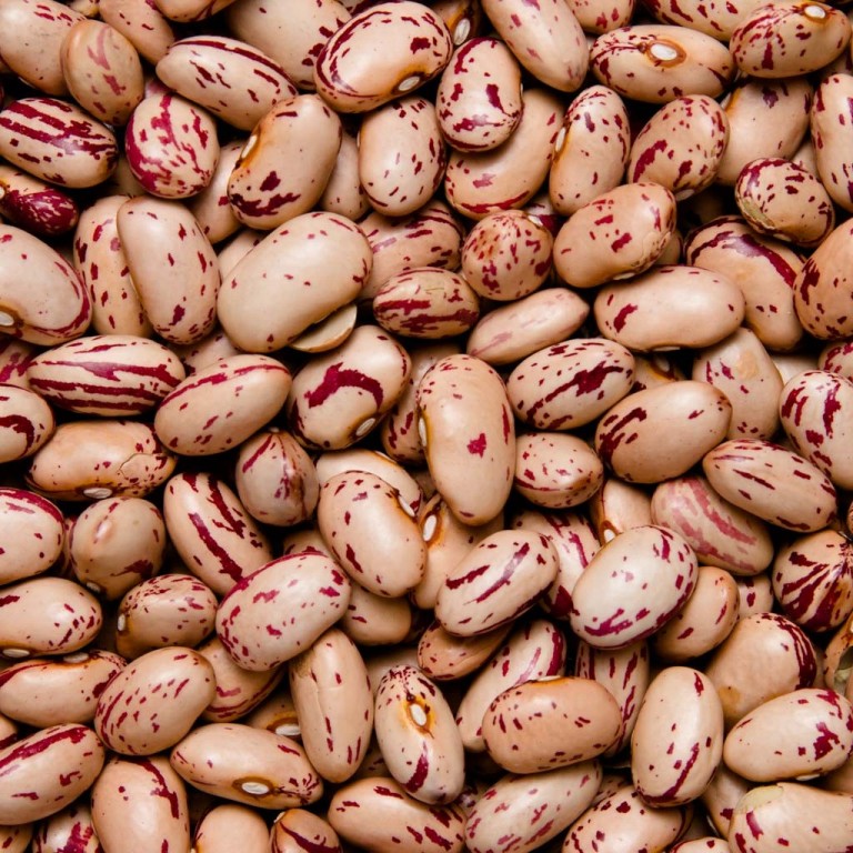 Alubia pequeña y redondeada, con jaspeado de color vino sobre fondo marfil.